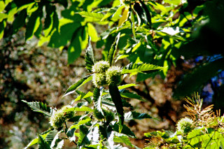 Esskastanie — Castanea sativa![]() Bild: D. Nikolaus Die Esskastanie, auch Edelkastanie oder Marone genannt, hat ihren Verbreitungsschwerpunkt in Südeuropa, Nordafrika und Kleinasien. Sie wurde wie die Weinrebe (Vitis vinifera) durch die Römer nach Mitteleuropa gebracht. Hier findet man sie in größeren Garten- und Parkanlagen. In größeren Beständen trifft man sie auch in Wäldern mit sommerlich trockenen und sehr warmen Bedingungen an wie in den Mosel-, Saar- und Nahegebieten. Die Esskastanie wächst bevorzugt auf sauren, sandigen und kiesigen Böden. Heute profitiert sie von der globalen Erwärmung und kommt als wärmeliebende Art bereits in für sie eigentlich untypischen Arealen wie in den Wäldern um Hameln vor. Die Esskastanie ist nicht zu verwechseln mit ihrem Namensvetter der Rosskastanie (Aesculus hippocastanum). Ihre länglichen Blätter und die Früchte sind weitaus stachliger. Außerdem bilden die Früchte zwei bis drei dunkelbraune, essbare Samen aus. Diese sind in Norddeutschland an warmen Standorten Ende Oktober reif. In südlichen Ländern sind die süßen Früchte ein beliebtes Nahrungsmittel. Sie werden zu Konfitüren, Süßspeisen, Fladen, Kuchen und Torten aber auch zu herzhaften Speisen und Soßen verarbeitet. Das Holz der Esskastanie ist sehr dauerhaft und wetterbeständig und wird ähnlich dem der Eiche genutzt. Auffallend ist ihr hohes Ausschlagvermögen. Wird ein Baum gefällt, treibt er neu aus. Esskastanien können bis zu 500 Jahre alt werden.